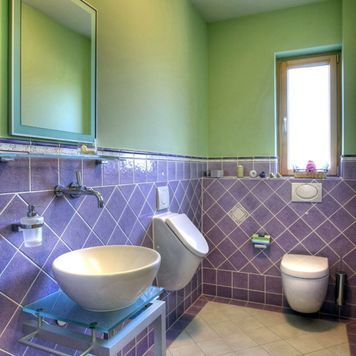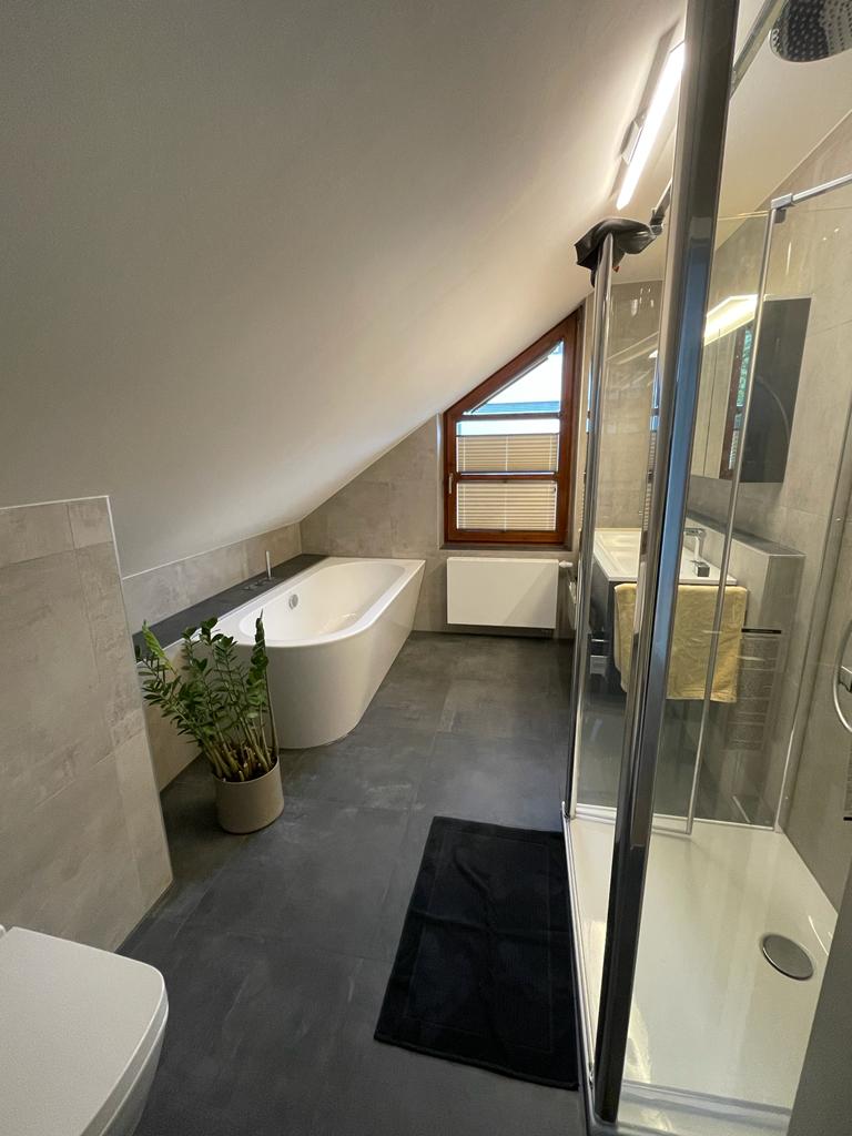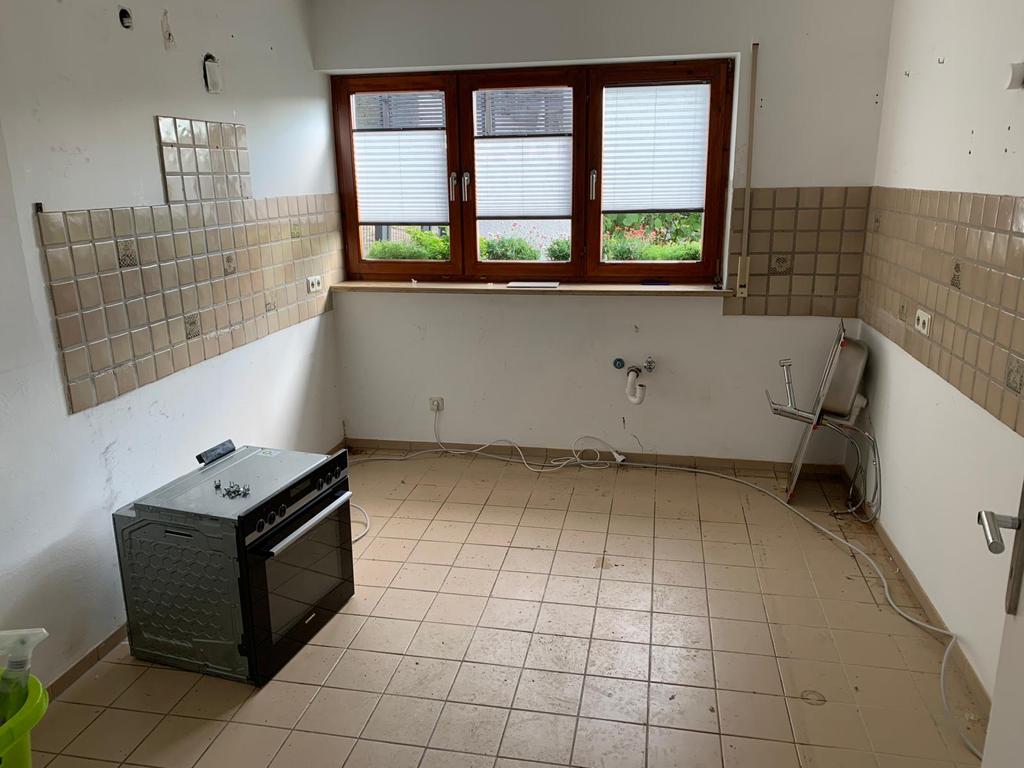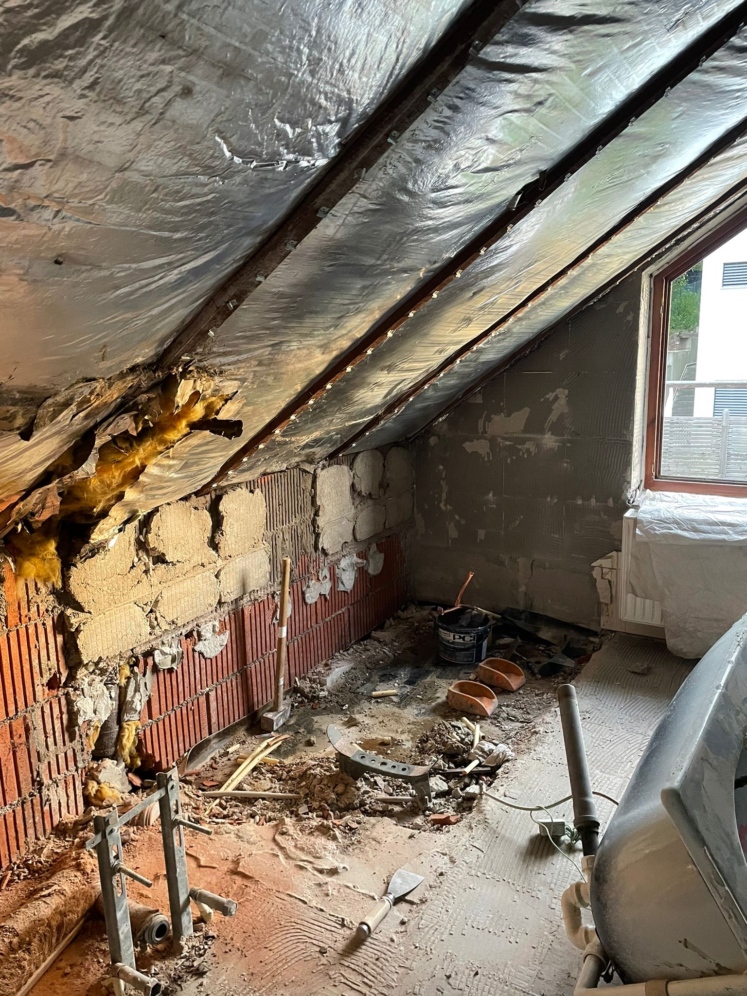 Bevor wir mit der eigentlichen Instandsetzung beginnen konnten, mussten wir zunächst den Verbundestrich beseitigen. Hierfür setzten wir einen Verbundhammer der Firma Wacker Neuson ein, der uns dank seines Gewichts von 25 Kilogramm wertvolle Dienste erwies. Anschließend verlegten wir neuen Zementverbundestrich mit Haftbrücke im Gefälle.