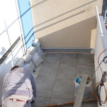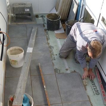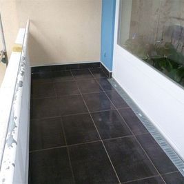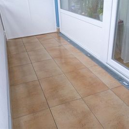 Um die Balkone optimal abzudichten, verlegten wir auf der Abdichtungsbahn die Drainmatte Gutjahr T+. Sie diente uns als Grundlage für 20 Millimeter starke Keramikelemente im Format 40x60 Zentimeter vom Qualitätshersteller Ströher. Generell setzten wir für die Verlegung das Gutjahr Terramaxx System ein, das über eine Aufbauhöhe von etwa 35 Millimetern verfügt.